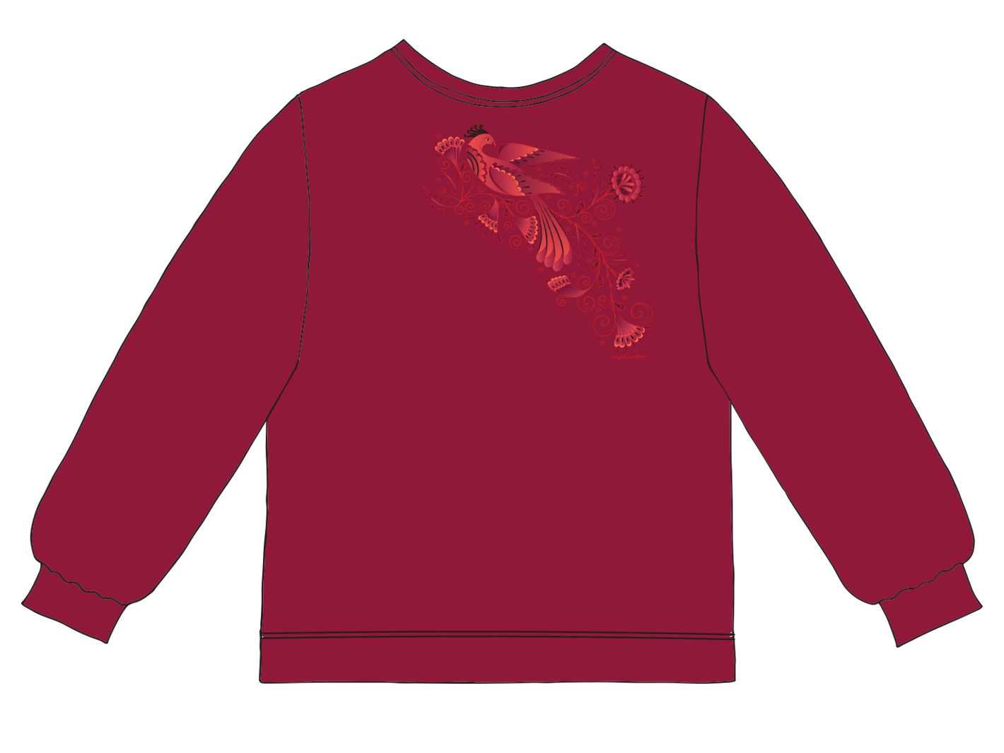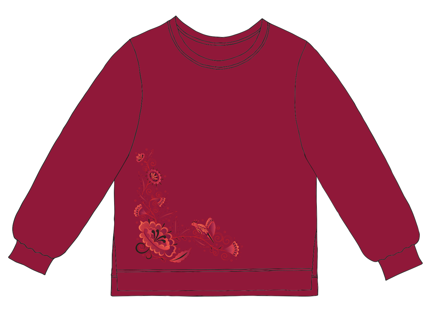 French Terry Cozy Crew- (ftcc) Flattering, refined and always cozy! Hemmed just below the hip, scooped crewneck, fashionable side vents, stitching details and 2" rib knit trim at bottom hem and sleeve cuffs. A looser fit is meant to be worn for cozy days or to layer for a night on the town. Made in the USA of soft 100% cotton, garment dyed French Terry.