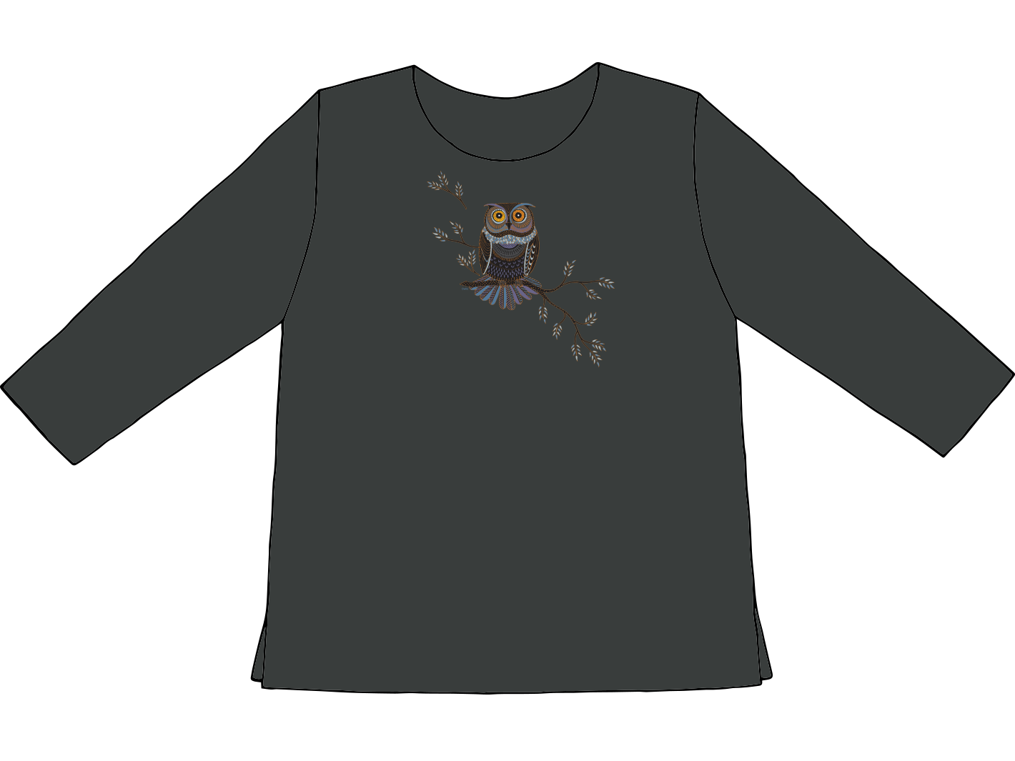 Ladies 3/4 Sleeve Top- (3/4s) Our own flattering missy cut, hemmed below the hip with a scoop neckline, side vents and bracelet length sleeves.  Made in the USA of soft 100% garment dyed cotton. Medium approximately 28" long and 21" wide at the under arm.